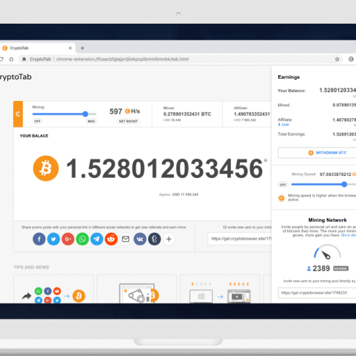 Experimente a versão completa do navegador CryptoTab para computador e desfrute da velocidade da sua extração poderosa.
